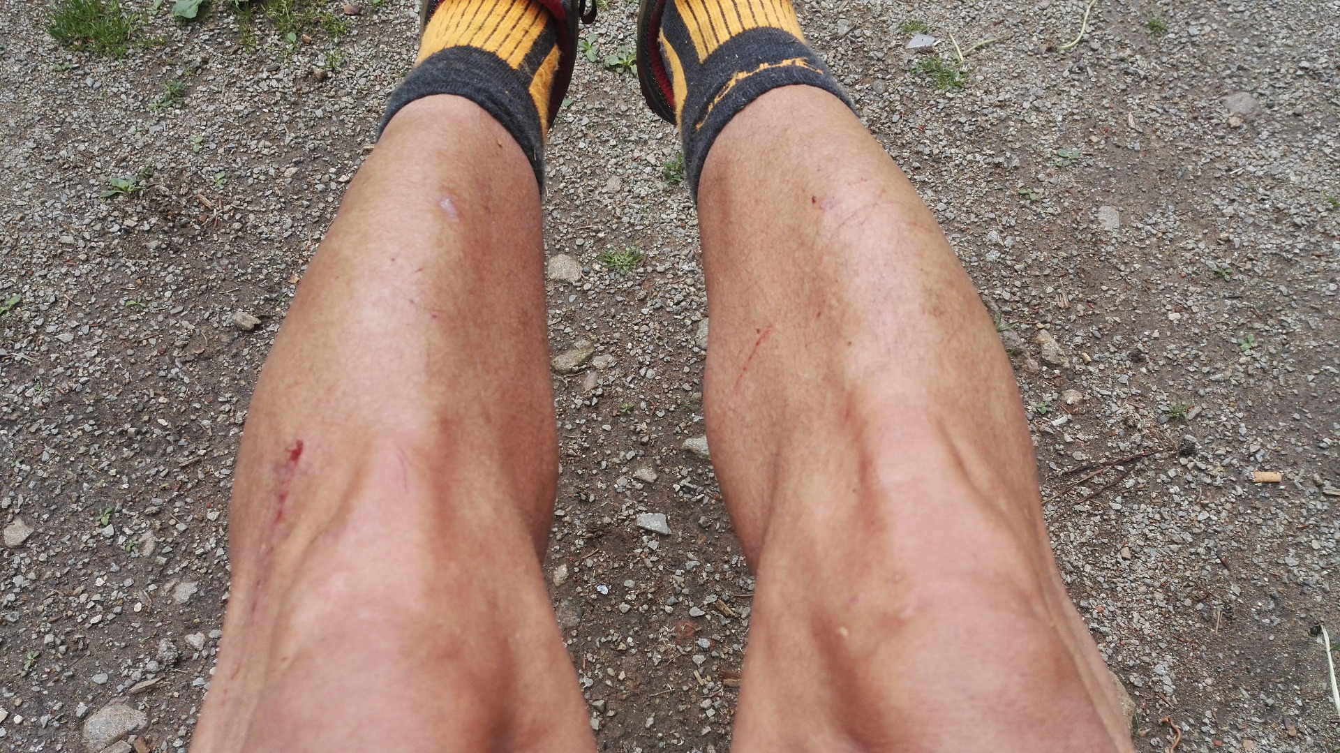 Cesta nestoupá nijak závratně a prvních zhruba pětset metrů je krásně udržovaná a široká. Když se pak na ní obejví první vyvrácené stromy, přelézáme je ještě s úsměvem. A pak najednou poměrně velký vývrat několika kmenů a za ním je místo cesty jen těžko rozeznatelná pěšinka. Přece to nevzdáme, říkáme si - teda hlavně si to říkám já - a pokračujeme v přelézání znovu a znovu se opakujících vývratů. Ale padlé stromy přestávaji být "čerstvé" a víc a víc jsou ztrouchnivělé (Už jste se někdy opřeli naplno o ztrouchnivělý strom? Já už jo a je to fuj.), kolem přibývá skalek a skal, to vše je hustě porostlé ostružiním a kopřivami. Navíc se kopec hodně zvedá a svah se stává téměř kolmým. Sice pokračujeme ve správném směru, ale o cestě se již dávno hovořit nedá. Když nad jedním svahem přelézám veliký kmen, na kterém není kde se zachytit, a zcela logicky začnu klouzat dolů, kde je jen velká díra, přepadne mě myšlenka na ústup. Oba jsme dodrápaní od ostružin a skály nad námi neslibují lehkou cestu. Skálolezci teda nejsme. A tak šikmo dolů svahem na křížovou cestu je asi to nejlepší řešení. Během slézání dolů poprvé udeřily blesky a zahřmělo. Zatím naštěstí jen přes údolí. Takže po chvíli stojíme opět u dvanáctého zastavení podrápaní a špinaví, ale spokojení, že máme pod nohama pevnou cestu, která spolehlivě někam vede. Odměňujeme se nalezením kešky u kaple a volíme bezpečnější pokračování. To co jsme chtěli ušetřit na čase a vzdálenosti, jsme stejně naším kamzíkováním nabrali.